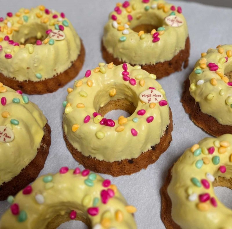 Gemaakt van vanillie cake, gevuld met stukjes abrikoos en afgewerkt met een laag witte chocolade.